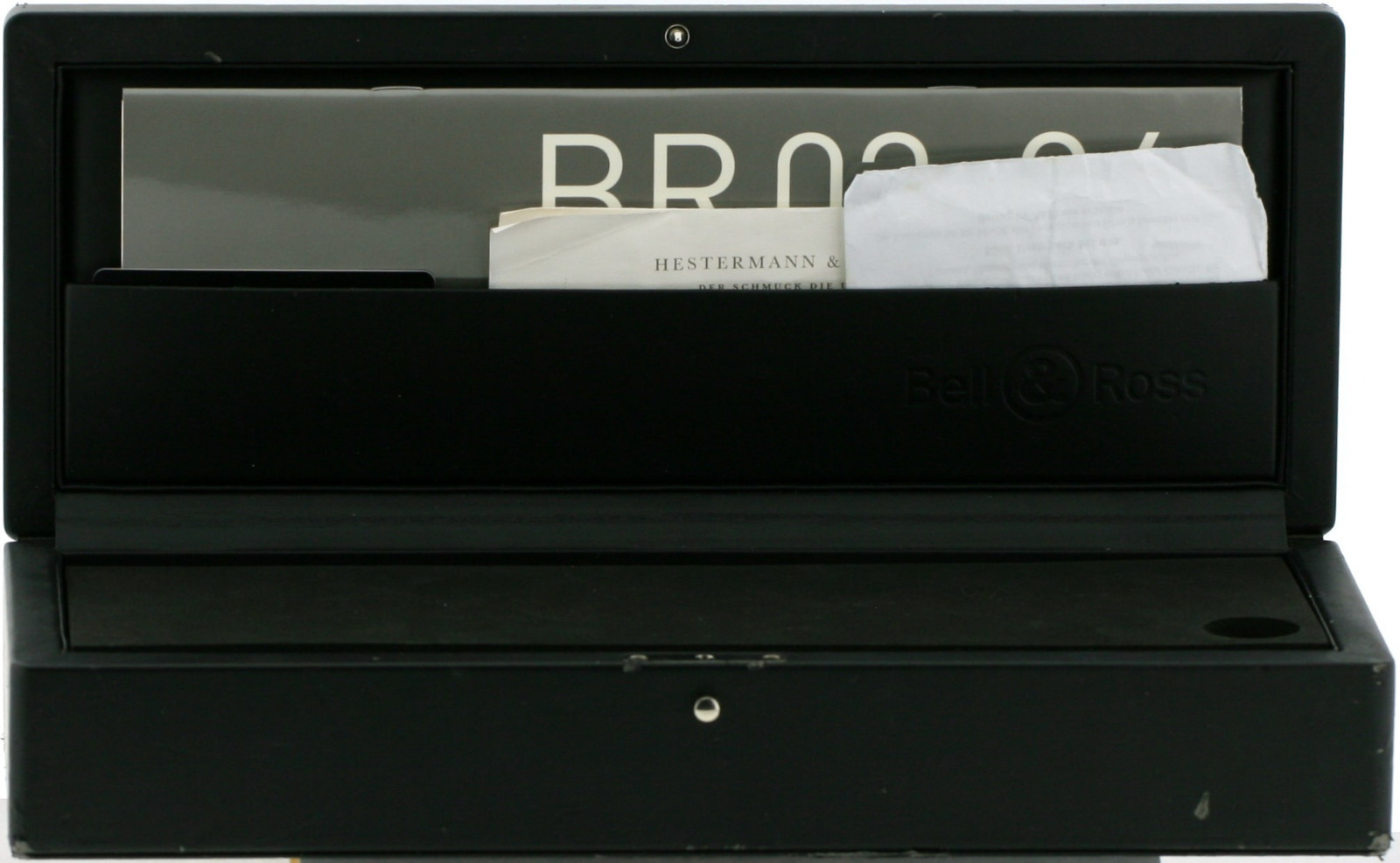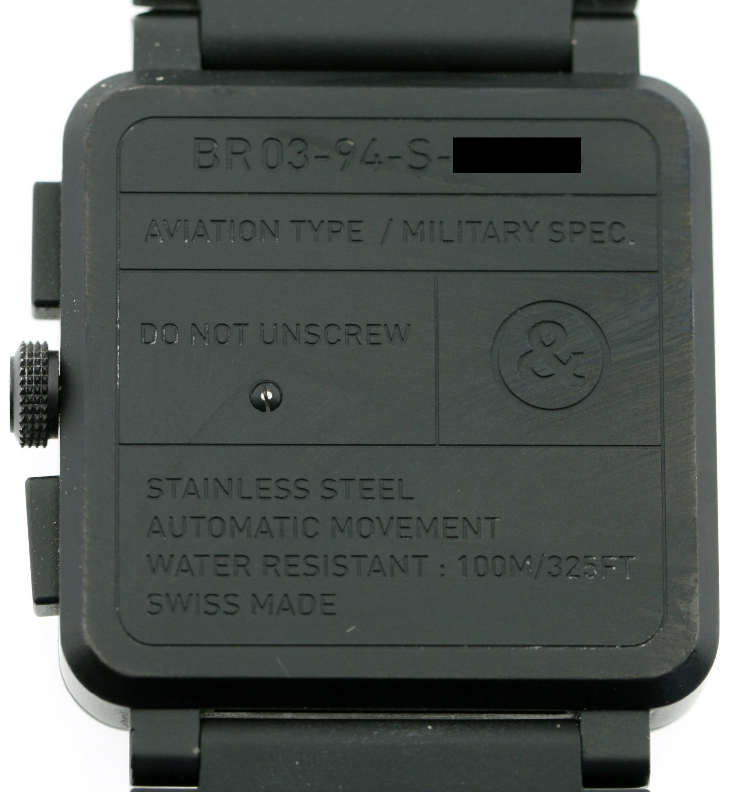 ZIFFERBLATT: Originalesschwarzes Zifferblatt mit gradlinigen schwarzen Zeigern, arabischenZiffern, signiert mit Bell & Ross