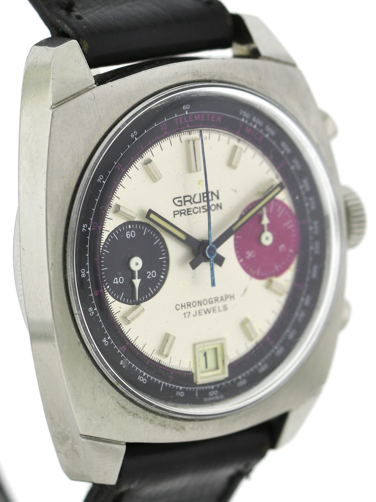 Silbrig-weiß, aufgesetzte, silberfarbene Indexe, silberfarbene Zeiger mit Leuchtmasse (inaktiv), signiert „GRUEN PRECISION“, für das Alter guter Zustand, leichte bis mittlere Patina |